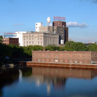 De Hennepin Island waterkrachtcentrale herbergt vijf generatoreenheden in haar industriële structuur aan de Mississippi River op coördinaten 44.9824, -93.2542.