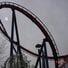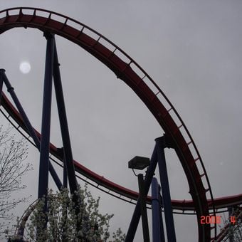 De rode rail met witte streep strekt zich uit over 3,081 voet lengte en bereikt snelheden van 60 mijl per uur door vier inversies.
