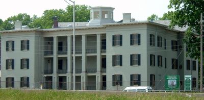 Het ziekenhuisgebouw vertoont Griekse Revival-architectuur met een drielaags centraal blok en symmetrische vleugels op een heuvel bij de Ohio River.