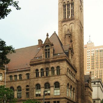 Het Allegheny_County_Courthouse is een districtsgerechtsgebouw in het centrum van Pittsburgh met vijf verdiepingen van granieten blokken, een centrale binnenplaats en een klokkentoren boven Grant_Street. Het gebouw herbergt de afdelingen voor civiele, criminele, familie- en erfrechtzaken, evenals de Gemeenterechtbank van Pittsburgh.