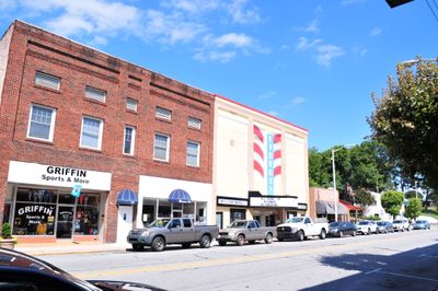 Het Liberty Theater uit 1946 staat tussen gebouwen in Classical Revival en vroege commerciële stijl uit het begin van de 20e eeuw.