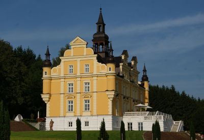Het kasteel toont een mengeling van Renaissance- en historische bouwstijlen die in de facade zichtbaar zijn. Dit mengsel weerspiegelt hoe de architectuur in deze regio zich over verschillende perioden heeft ontwikkeld.