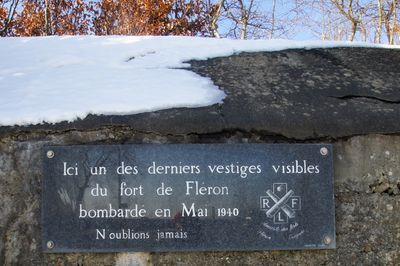 De overgebleven frontmuur toont inscripties ter nagedachtenis aan de soldaten die het fort verdedigden tijdens beide wereldoorlogen.