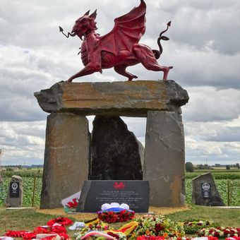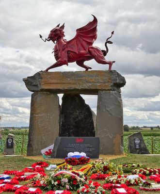Het Welsh Nationaal Herdenkingspark toont een groot rood drakensculptuur dat Wales vertegenwoordigt, samen met gedenkstenen voor militaire eenheden.