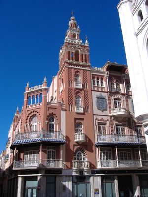 De Giralda-toren is een schaalmodel van de beroemde klokketoren van Sevilla, met ingewikkelde keramische tegels, decoratieve bloempotten en gedetailleerde metalenwerk op de gevel. Het neo-mudéjar gebouw staat opvallend op het Plaza de la Soledad.