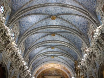 San Esteban is een kerkgebouw in Valencia met een enkel schip en kapellen verdeeld tussen steunberen. De buitenkant toont eenvoudige muren versierd met waterspuwers, een klokkentoren, en het interieur bevat witte filigreemdecoraties tegen blauwe achtergronden.