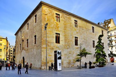 Het Hospital de Santa Maria de Lleida is een laat gotisch gebouw in de buurt van de Cathédrale Nova, gekenmerkt door stenen muren, spitsbogen en een centrale binnenplaats met uitzicht op een versierde bovenste galerij. De structuur strekt zich uit over meerdere niveaus, waarbij de bovenverdieping opvalt door haar decoratieve zuilenarijen.