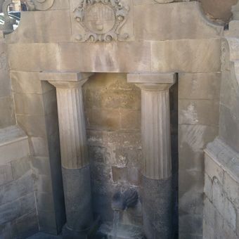 De Leeuwenfontein toont een in steen gehouwen leeuwenkop waaruit mineraalrijk thermaal water stroomt met een temperatuur van 74 graden Celsius.