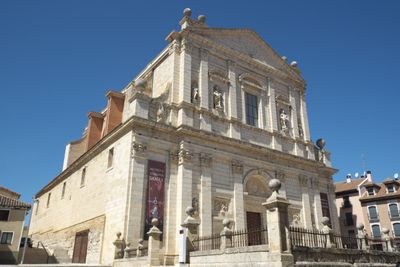 De Santa Cruz Kerk vertoont een stenen structuur met geometrische lijnen volgens de Herreriaanse architectuurprincipes van de Spaanse Renaissance.