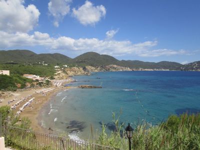 Platja des Figueral, Olijfkleurig zandstrand in Santa Eulària des Riu, Spanje.