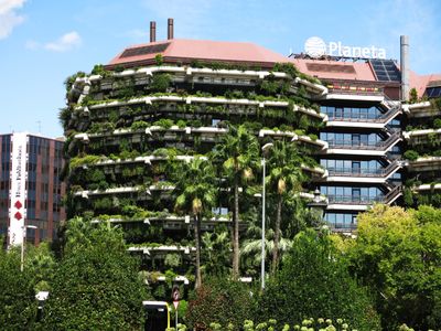 Het kantoorcomplex bestaat uit drie achthoekige torens met verticale tuinen die de hele buitenkant bedekken via een irrigatiesysteem.