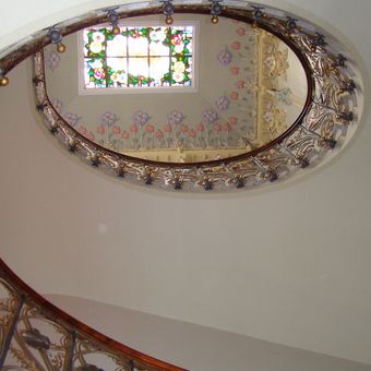Het interieur bewaart het originele edelhout, polychrome stucwerk en nimfschilderingen die de burgerlijke levensstijl van begin 20e eeuw weerspiegelen.