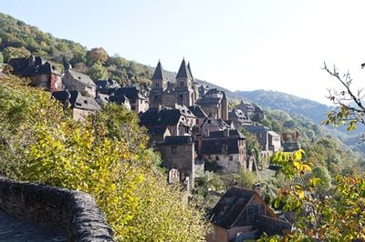 Conques is een dorp in het departement Aveyron met smalle straatjes tussen huizen van rode zandsteen en leistenen daken. De straten stijgen in terrassen langs de hellingen van een diepe vallei terwijl de rivier de Dourdou beneden stroomt.