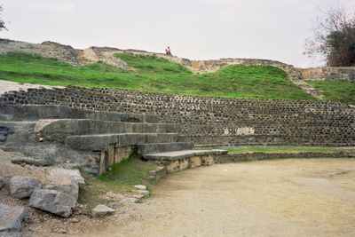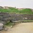 Het antieke theater strekt zich uit over een beek met stenen funderingen, gebogen zitgedeelten en overblijfselen van een theaterplatform van 68 meter diameter.