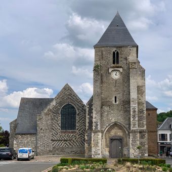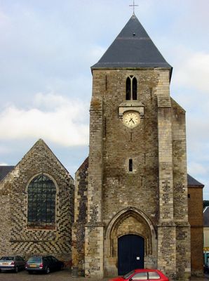 De kerkmuren vertonen een kenmerkend schaakbordpatroon van gesneden vuursteen en steen, dat de traditionele bouwmethoden van de Picardische kust vertegenwoordigt.