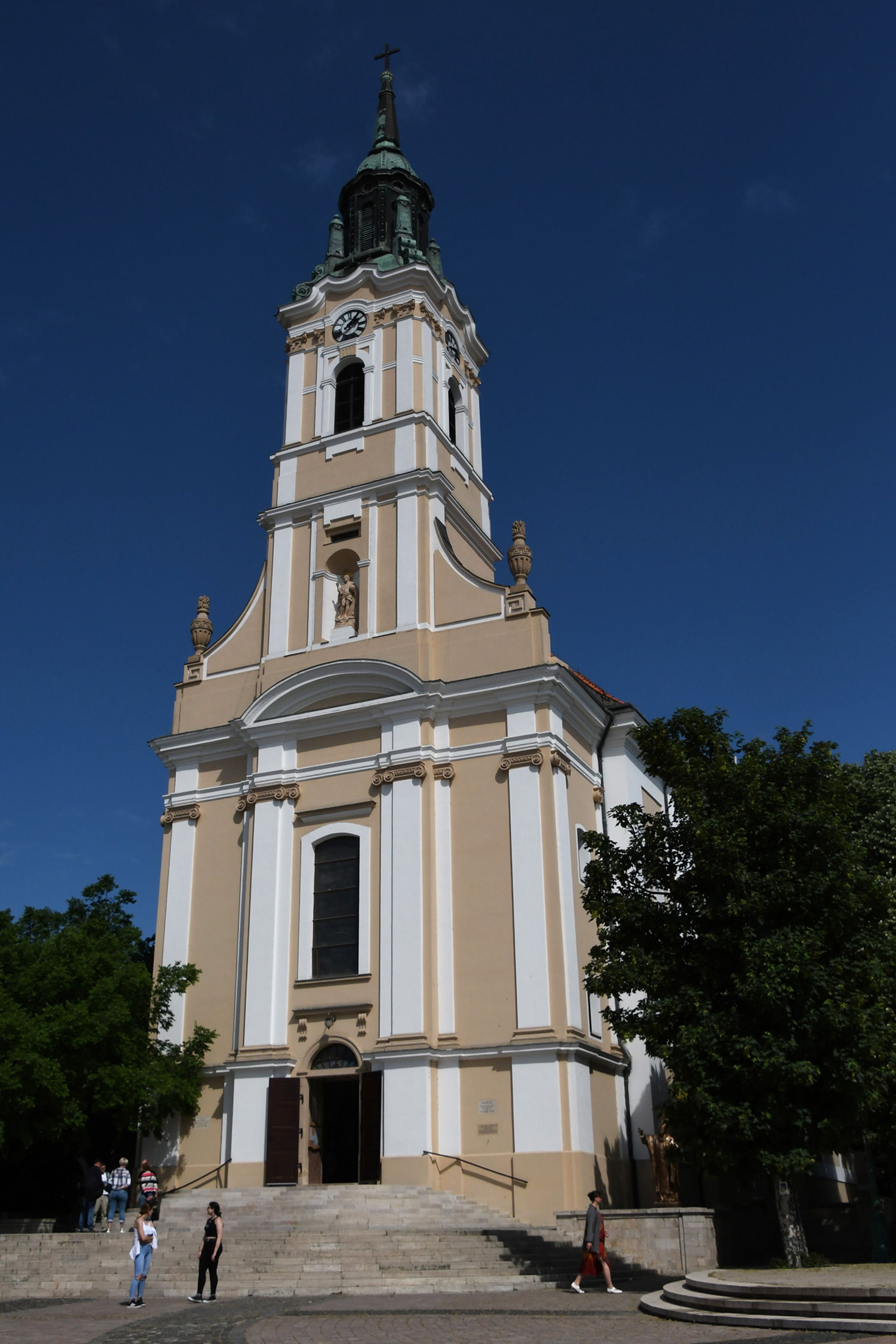 De binnenstad parochiekerk staat aan het Koning Béla Plein met zijn hoge toren en klassieke architectonische elementen.