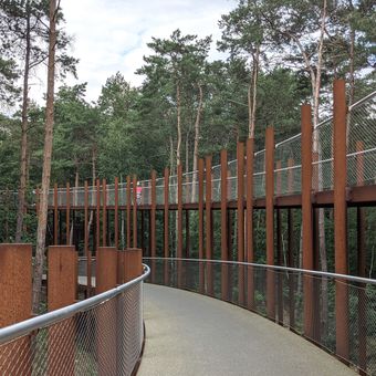 Fietsen door de Bomen is een verhoogde fietsroute die zich 10 meter boven de grond uitstrekt via een dubbele cirkelvormige lus van 700 meter. De constructie van cortenstaal kronkelt door de naaldbossen van het Nationaal Park Bosland.