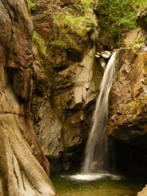 De Kostenets waterval stort zich over rotsformaties en creëert een voortdurende waterstroom die van verschillende punten zichtbaar is. De rotsachtige wanden zijn bedekt met begroeiing die de cascade omringt.