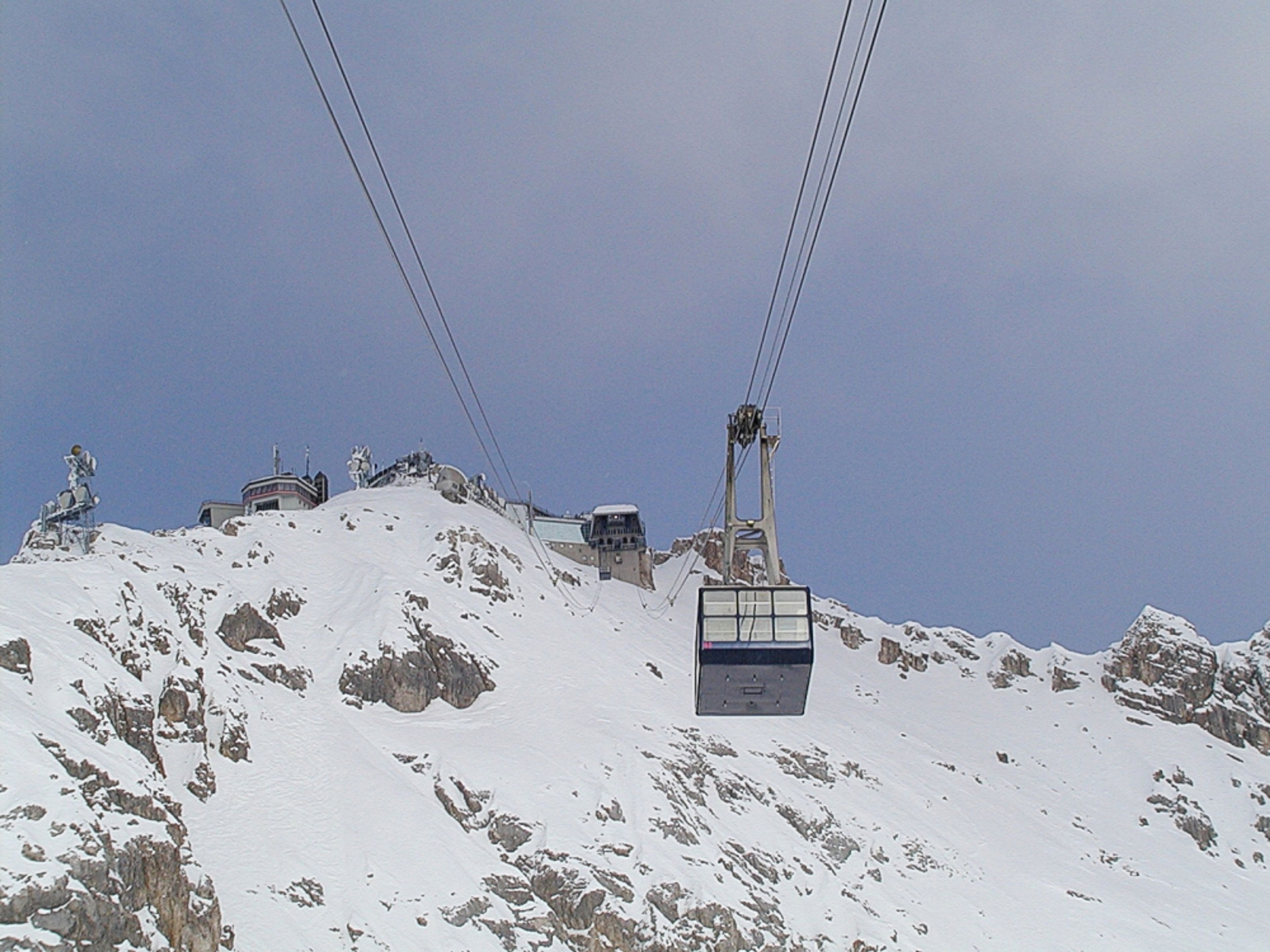 De Zugspitze Gletsjerkabelbaan overbrugt een afstand van 1.000 meter van het Zugspitzplatt plateau naar de top met een hoogteverschil van 360 meter.