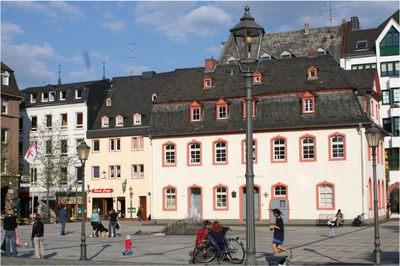 De Alte Münze staat op de Münzplatz in de oude binnenstad van Koblenz, met een barokke gevel met symmetrisch geplaatste vensters.