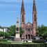 De tweelingtorens van Sint-Bonifatius reiken 68 meter hoog en zijn zichtbare herkenningspunten vanaf het Luisenplatz in Wiesbaden.