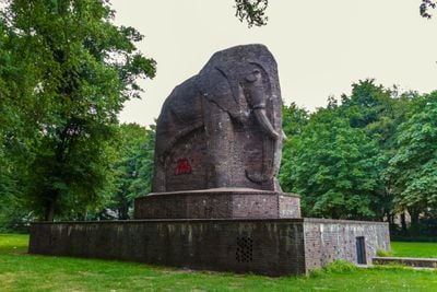 Het olifantvormige monument, gebouwd van donkerrode bakstenen, verheft zich 10 meter in het Nelson Mandela Park.