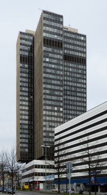 De Steglitzer Kreisel bereikt een hoogte van 120 meter met 27 verdiepingen, diagonaal tegenover het stadhuis aan de Schlossstrasse in Berlijn.