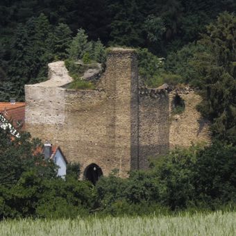 De stenen versterking toont een schildmuur met een zeshoekige hoektoren, een ronde toren en overblijfselen van de hoofdtorenstructuur.
