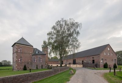 De stenen vesting staat tussen Kranenburg en Kleve, met twee hoektorens en een Renaissance-poort aan de rand van het Nederrijnse landschap.