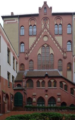 Het vijf verdiepingen tellende St. Afra complex combineert woonruimtes met een neogotische kerk aan de Graunstrasse 31 in Berlijn.