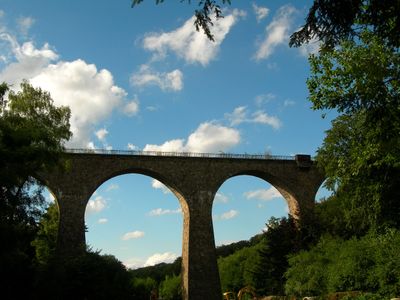 De Eulenbachbrug strekt zich 168 meter uit over het dal met zeven stenen bogen en bereikt een hoogte van 40 meter.