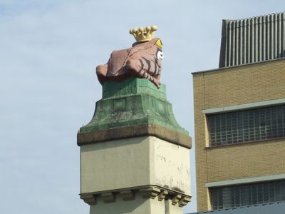 De kikker werd in de jaren 1950 opgericht als advertentiesymbool voor een schoensmeersmerk. Na decennialange blootstelling aan weersinvloeden is het beeld vanaf de jaren 2010 volledig gerestaureerd om de structuur en verlichting te moderniseren.