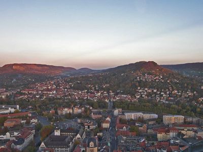 De Hausberg rijst op aan de oostkant van Jena en toont kalksteenformaties samen met een prominente toren op zijn top. De omgeving bestaat uit wandelpaden en ruïnes die het karakter van de heuvel bepalen en bezoekers uitzichten over de stad bieden.
