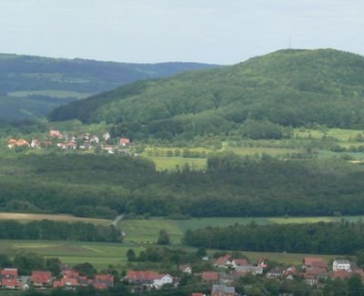 Bij helder weer zijn de torens van de Kathedraal van Bamberg zichtbaar aan de verre horizon, wat een onverwachte verbinding schept met een historische stad beneden. Dit verre oriëntatiepunt helpt wandelaars hun positie in het bredere regionale landschap te begrijpen.