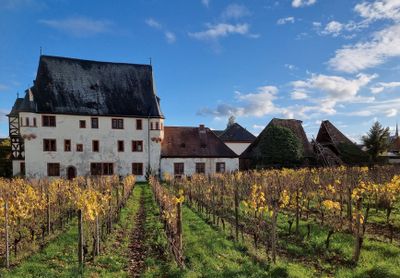 Het drie verdiepingen tellende Schloss Schönborn staat te midden van omsloten wijngaarden, met een leien zadeldak en een veelhoekige traptoren.