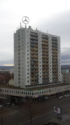 Het Mercedes-Hochhaus reikt 55,4 meter de lucht in met 18 verdiepingen, met 216 appartementen en vijf opslagruimten nabij Holländischer Platz.