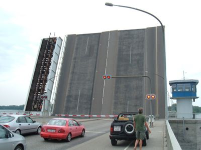 De brug werkt met twee afzonderlijke basculesecties, één voor voertuigen en één voor treinen, die op regelmatige intervallen openen voor maritiem verkeer.