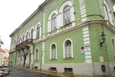 Het Estlandse Ridderhuis toont grote ramen, symmetrisch ontwerp en sierlijke architectonische details op de stenen gevel aan Kiriku plats 1.