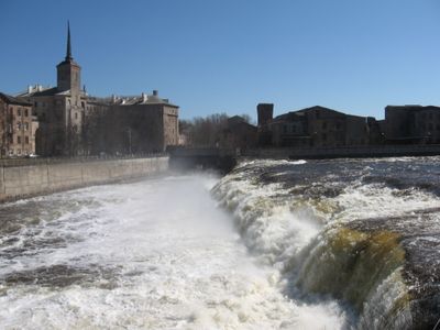 De Narva-rivier stroomt over de Baltische Klint en vormt twee verschillende watervalsecties gescheiden door het Kreenholm-eiland met hoogtes tot 6.5 meter.