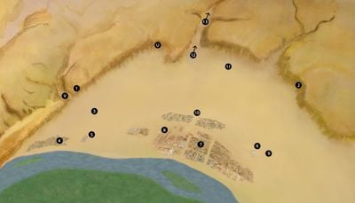 De overblijfselen van Achetaton strekken zich uit langs de oostelijke oever van de Nijl, met fundamenten van tempels, paleizen, woongebieden en productiefaciliteiten.