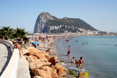 Het strand biedt direct uitzicht op Gibraltar en markeert de grens tussen Spaans en Brits grondgebied.