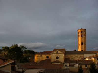 De campanile werd gebouwd met hergebruikt steen van Romeinse structuren, wat verschillende historische perioden in één oppervlak mengt. Deze menging van materialen laat zien hoe de stad haar verleden in nieuwere constructies integreerde.