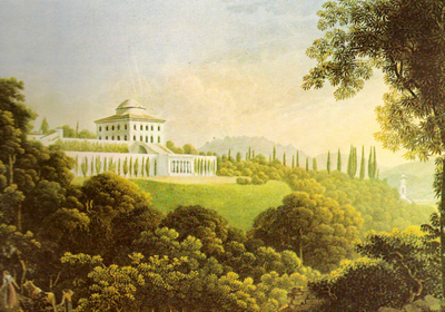 De villa heeft een monumentale hemisferische koepel die kilometers ver zichtbaar is, met twee grote gevels versierd met kolossale kariatiden die de structuur ondersteunen.