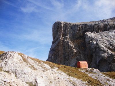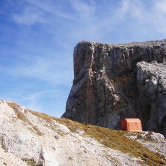 De Società degli Alpinisti Tridentini bouwde deze bergschuilplaats in 1972 ter ondersteuning van klimmers die de steile kliffen van de Dolomieten verkennen.