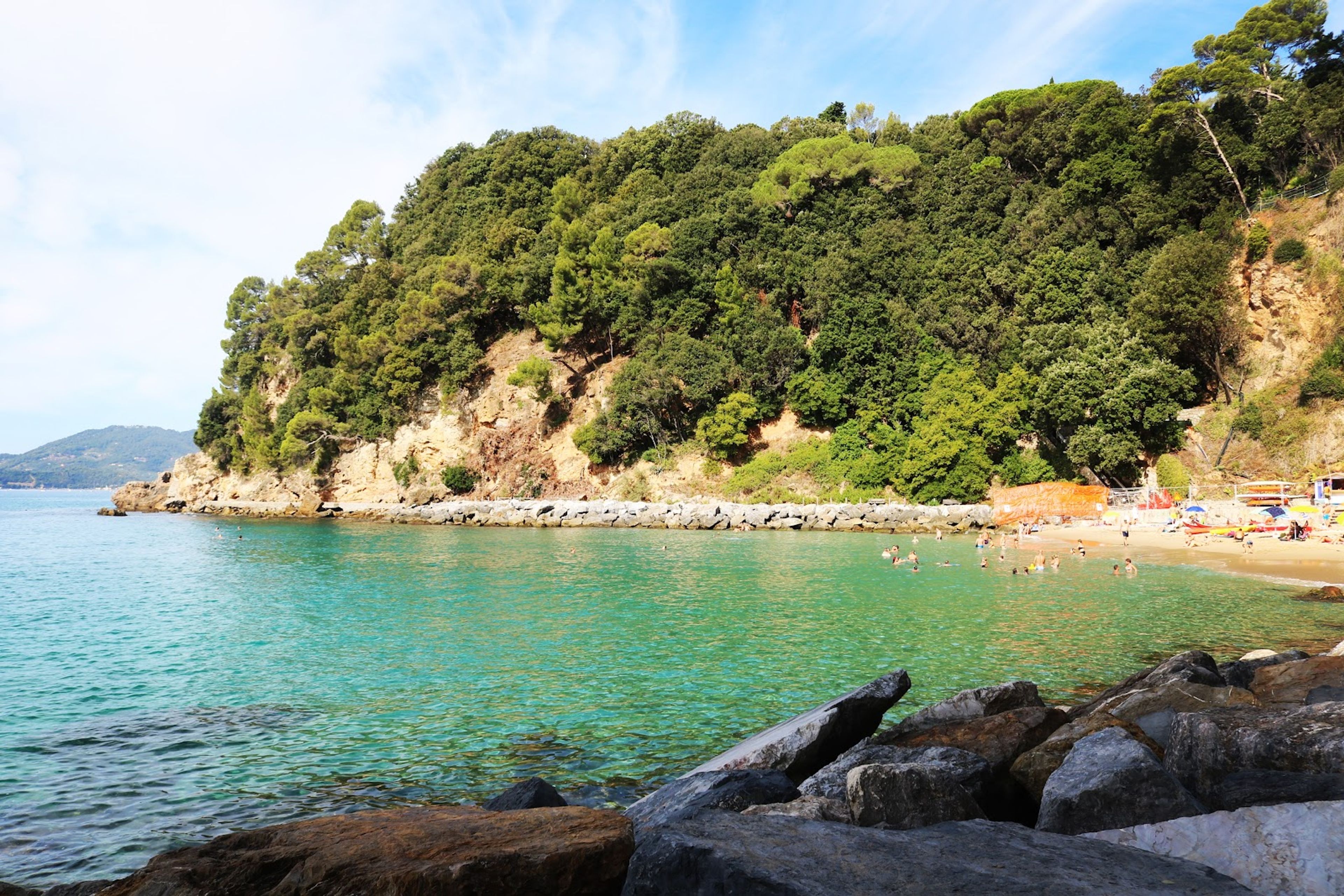 De Spiaggia della Marinella di San Terenzo strekt zich uit langs de Ligurische kust met zacht zand en helder water geschikt voor zwemmen.