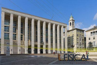 Het Palazzo della Libertà staat als een monumentaal gebouw in Bergamo, met strakke lijnen en geometrische vormen kenmerkend voor rationalistische architectuur.