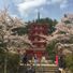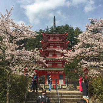Het park toont een vijfverdiepingen tellende pagode tegen de achtergrond van de Berg Fuji, met 650 kersenbomen op de hellingen van Berg Arakura.