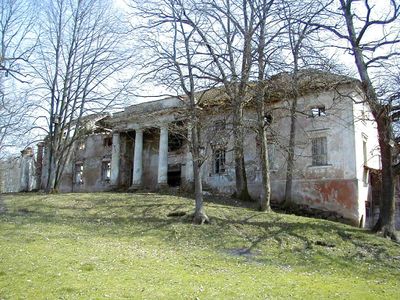Het landhuis toont klassieke architectonische elementen met een symmetrisch ontwerp, witte muren en traditionele Baltische verhoudingen over meerdere verdiepingen.