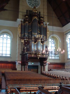 Het Van den Heuvel orgel bevat 80 registers en 104 rijen, geplaatst achter een gerestaureerde facade uit 1822 in de Nieuwe Kerk.