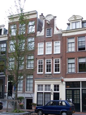Pand met halsgevel met palmet in de afdekking en een steen waarop ao 1740 t scrikkeliaar (sic, Rijksmonument op Bloemgracht 172